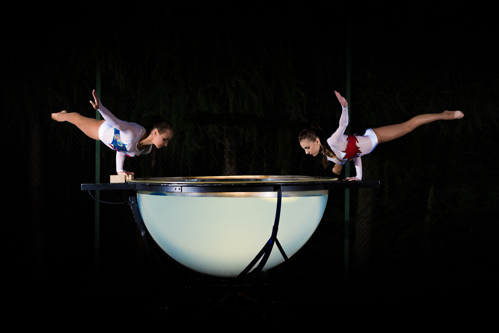 Pomyślałem, że najlepiej będzie zrobić zdjęcia wieczorem i po zmroku. Zanim zaszło słońce, zrobiliśmy kilka "standardowych" zdjęć prezentujących sylwetki akrobatek. Prawdziwa "zabawa" zaczęła się jednak po zmroku. Do oświetlenia skorzystałem z dwóch lamp błyskowych wyzwalanych radiowo. Jedną podświetlałem kulę od spodu, żeby uzyskać ciekawy efekt "świecącej kuli", drugą zaś oświetlałem Celinę i Wiktorię z daleka. Lampa oświetlająca kulę od spodu "zarysowywała" też sylwetki dziewczyn "odcinając" je od tła. Przy każdej zmianie układu na kuli trzeba było też zmieniać ustawienie oświetlenia. Na szczęście mam wysokiej klasy aparat fotograficzny, więc spisywał się świetnie nawet w niemal kompletnej ciemności.